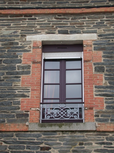 Gros oeuvre en moellons de schiste. Les encadrements des baies sont partiellement en brique. Bandeau horizontal en brique.