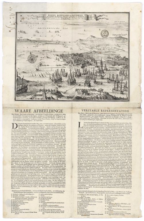 Collection Nivart. MS144_251. Saint-Malo. Véritable représentation des forts, barricades et batteries, pour couvrir les vaisseaux françois enfuis dans le port de Saint-Malo, ainsi qu´ils y sont présentement, suivant l´original par R. Bougard. Amsterdam.Plan, support papier, 0,425 x 0,643 mètre, 4e quart 17e siècle, 1692.