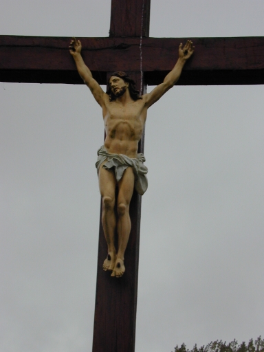 Croix en bois. Sculpture du Christ en ronde-bosse en fonte de fer polychrome. Inscription sur le socle : 1995.