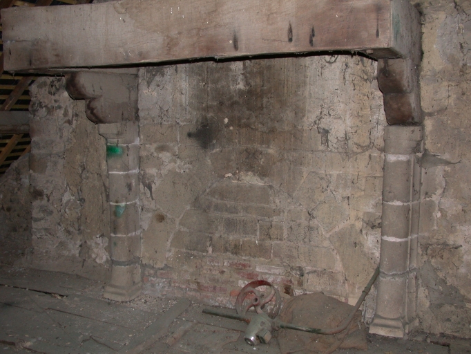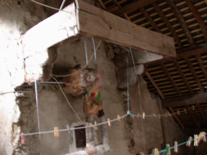 Décharge. Porte en état sans serrure, sol concave, fenêtre avec verrou, six vitres, cheminée et foyer sans enduit, jour à l´Est clos, plafond et murs fermés sans enduit, porte intermédiaire en état avec verrous ronds.