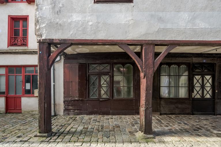 Maison à gouttereau sur rue et porche à trois travées. La profondeur du porche est de 2m50 environ et les écarts entre poteaux sont de 2m75 en moyenne. La hauteur sous sablière atteint 2m65. Les poteaux sont chanfreinés sur les 4 angles. Des aisseliers soutiennent la sablière et comportent des marques d'assemblage.