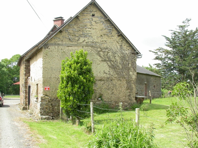 Cette ferme est construite en moellon de grès. Les ouvertures sont en pierre de taille de granite, sauf une qui est en brique. La façade est percée d'une porte en plein cintre à bords chanfreinés, de deux fenêtres avec linteau droit, pierre d'appui saillant et bords chanfreinés, et d'une seconde porte aujourd'hui transformée en fenêtre. Le linteau de la fenêtre du rez-de-chaussée est sculpté de coquilles.