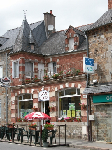 Intéressante construction de la limite du 19e siècle et du 20e siècle, en grande partie en briques, construite en rupture d'alignement sur rue ; une avancée à vocation commerciale en rez-de-chaussée ménage à l'étage une terrasse joliment agrémentée d'un petit avant corps en coin, perpendiculaire au logis et couvert d'une toiture en pavillon.