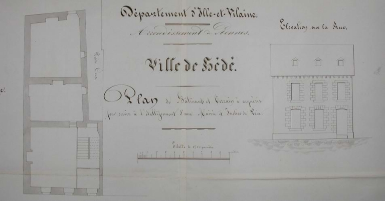 A. D. Ille-et-Vilaine. Série O : Administration et comptabilité communales. Mairie, justice de paix ; construction : plans des bâtiments à acquérir, affichage d'adjudication des travaux (1843) : 2 O 131/27.