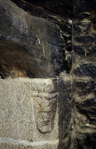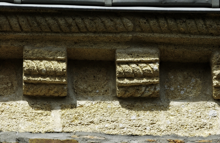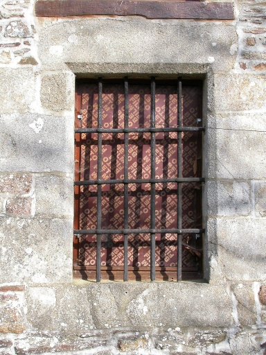 Une fenêtre grillée avec chanfrein sur le linteau et les piédroits. Corniche en calcaire.
