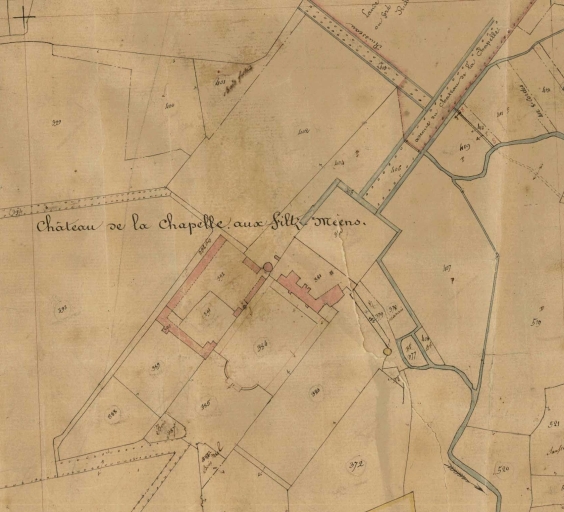L'origine du château de la Chapelle-aux-Filtzméens est encore mal connu. Une motte serait à l'origine de l'établissement du château actuel, comme le rappelle encore la toponymie puisque deux parcelles situées à l'Ouest de l'entrée s'intitulent toujours « le pré des mottes ». Le château : Le château tel que nous le voyons aujourd'hui est une construction des 16e et 17e siècles. Les vestiges les plus anciens se situent dans la partie Est du logis principal, notamment une cheminée monumentale située dans la partie basse du château. Les différences de mise en oeuvre et les reprises d'appareillage semblent indiquer une reconstruction de la partie Ouest. Les encadrements des baies et le décor Renaissance de l'ancien logis semble avoir été réutilisé en façade principale. Ces travées dont les ordres sont clairement affirmés et disposés constituent de beaux témoins de l'introduction de l'art de la Renaissance en Bretagne. On sait par ailleurs que la seigneurie de la Chapelle-aux-Filtzméens appartenait en 1513 au sieur de Saint Amadour. Il s'agit sans doute de François de Saint Amadour, chambellan du duc François II, capitaine de Saint-Aubin-du-Cormier et seigneur de Tizé. La qualité des vestiges en place pourraient être attribué à cette puissante et riche famille. Les dates de la reconstruction du logis ne sont pas plus définies que celles de la construction du premier logis. L'étude stylistique permet toutefois de dater cette campagne du début du 17e siècle. Le grand escalier rampe sur rampe date de cette période ainsi que la façade Nord plus austère. Parmi les éléments remarquables, il convient également de signaler un ensemble homogène de boiseries du 18e siècle, pièces d'apparat, chambres avec leurs alcôves. Le colombier : Le colombier du 17e siècle est en très bon état de conservation. Outre ses nombreux trous de boulins, il conserve son échelle à échalier. Sa tour lanterne à dôme a fait l'objet d'une restauration de qualité. La Chapelle (détruite) : Le chanoine Guillotin de Corson, dans le pouillé historique de Rennes, fait mention d'une chapelle dédiée à Notre Dame. Construite par les seigneurs de la Chapelle-aux-Filtzméens dans les jardins de leur manoir du dit lieu. En 1702, Louis-Hercule de Francheville, seigneur de Québriac, fonde par testament une chapellenie de sept messes par semaines, qu'un chapelain devait dire soit à l'église paroissiale, soit à la chapelle du château. Le puits : Le puits situé dans la cour antérieure proviendrait du château du Gage sur la commune de Pleugueneuc. Il porte gravé sur la pierre les armes de la famille de Saint-Gilles et la date de 1625. Le jardin : Le tracé du jardin actuel n'est qu'une pâle évocation du jardin du 18e siècle qui avait été dessiné à cette période. Le relevé des matrices cadastrales indique une organisation bien définie des parcelles, le parc, le jardin botanique, le labyrinthe, le jardin de la Basse-cour. L'orangerie date de l'aménagement du jardin. La métairie : L'ensemble de la métairie visible sur le cadastre de 1834 est encore en place aujourd'hui. Les bâtiments qui s'organisent autour d'une cour rectangulaire semblent remonter au 18e et 19e siècles. L'intérieur n'a pas été visité. Cette partie a été transformé lors de l'aménagement du camping du château. Intérêt départemental.