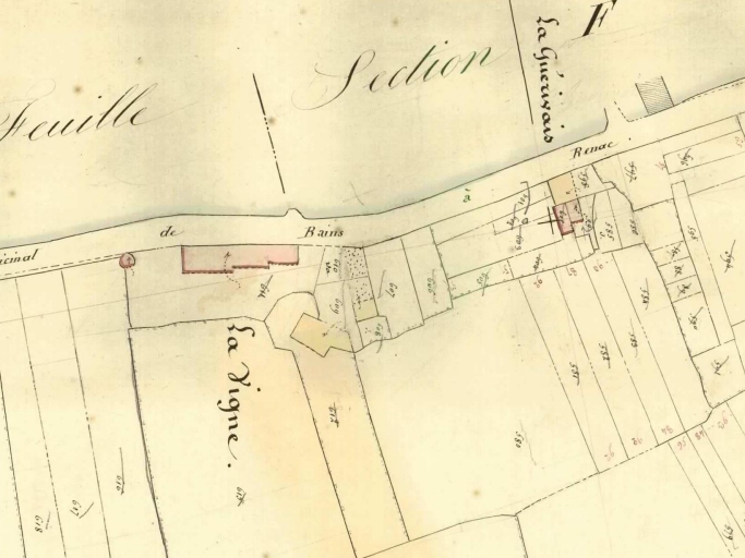 Ille-et-Vilaine. Commune de Bains-sur-Oust. Section M dite du Bourg, feuille 4, plan cadastral napoléonien, échelle : 1/1 000e, par le géomètre Demay, 1847. (A.D. Ille-et-Vilaine : 3 P 5245).