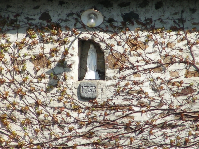 Cette maison est construite en moellon de granite et de schiste, certaines ouvertures ont des encadrements en gros appareil régulier de granite aux bords chanfreinés. La façade est ornée d'une niche à statue et d'une date 1763.