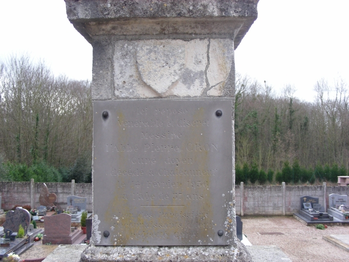Cette croix est réalisée en granite, ses bras ainsi que sa hampe sont chanfreinés. Le socle, en pierre calcaire, est décoré d'un écu lisse. Une plaque portant l'inscription suivante a été apposée sur le socle : Ici repose/Vénérable et discret/Messire/l'Abée Pierre CRON/Curé doyen/décédé à Châteauneuf/le 14 février 1956/à l'age de 57 ans/Don des Paroissiens/Reconnaissance à leur/regrété Curé.