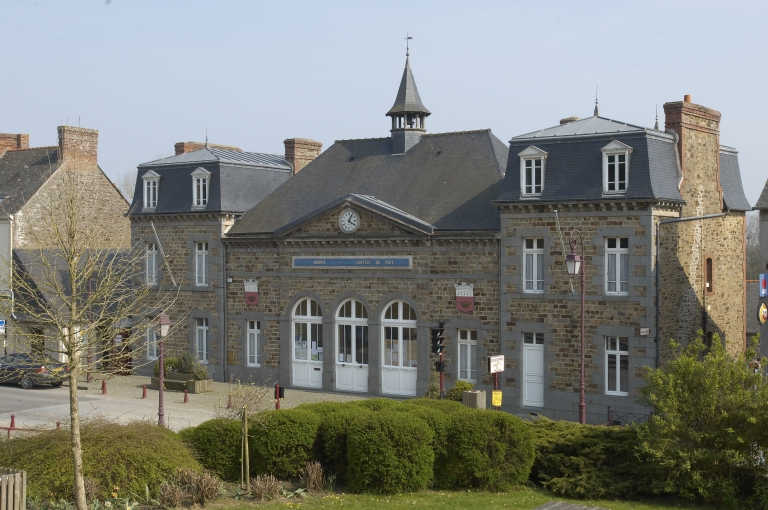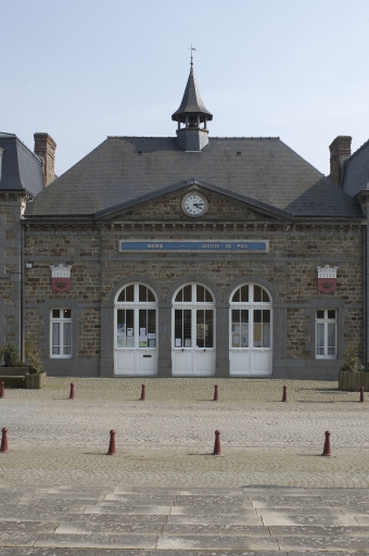 La façade sur rue de la mairie est composée de moellon équarri de granite, les toitures à croupes et à la Mansart sont couvertes d'ardoise et de zinc. Le corps de bâtiment central est percé de trois grandes arcades en plein cintre ; elles sont surmontées d'un fronton triangulaire dans lequel se trouve une horloge. Sous ce fronton, il existe une corniche et un cartouche qui porte l'inscription suivante : MAIRIE-JUSTICE DE PAIX. Cette partie est couverte d'un toit à croupes, surmonté d'un campanile. Les deux ailes latérales possèdent des façades sur rue rythmées par deux travées, composées de baies quadrangulaires. Ces ailes latérales sont couvertes de toit à la Mansart, surmontés d'épis de faîtage. Les encadrements de baies, les bandeaux et les chaînages d'angle de l'ensemble du bâtiment sont réalisés en pierre de taille de granite.