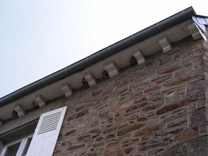 Ce bâtiment est élevé en moellon de granite et de schiste ; les encadrements de baies sont réalisés en pierre de taille de granite. Le toit à longs pans est par ailleurs couvert d'ardoise ; sous le toit, se trouve une corniche composée de corbelets en bois sculptés. L'ensemble est clos par un mur d'enceinte et des grilles en fer forgé.