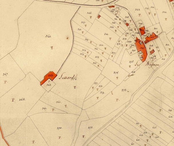 Parcelle quadrangulaire. Plan masse en L des anciens bâtiments. Nouveau logis isolé. Fossés en eau avec une retenue mentionnés sur le cadastre ancien. Orientation sud des logis.