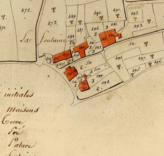 Implantation perpendiculaire à la voie principale. En retrait et parallèle au chemin rural des Fontaines. Ensemble hétérogène composé de logis élémentaires à une seule pièce à feu. Orientation sud.