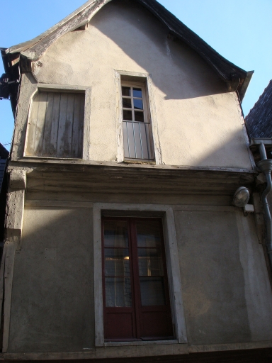 Cette maison est recouverte d'un enduit. Le porche en pan de bois sur poteaux repose sur des solins en pierre. Cette maison à porche et à pignon sur rue présente un rez-de-chaussée, un étage et un comble. Le sol du porche est recouvert de dalles de schiste et s'ouvre sur la cave par une trappe de bois aujourd'hui condamnée. L'étage enduit est percé d'une porte-fenêtre positionnée au centre de la façade. Entre le premier étage et le comble, on distingue un encorbellement sur solives à entretoises à décor en sifflet. Au centre du comble à surcroît, se trouvent une porte étroite et, sur la gauche, une ouverture plus large et moins haute.