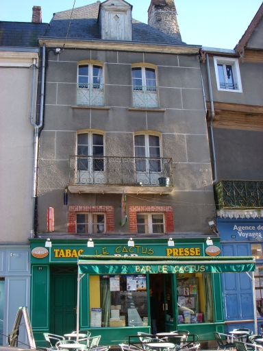 La maçonnerie de ce bâtiment est recouverte d'un enduit au ciment ; la toiture est couverte d'ardoise et le comble est percé d'une lucarne surmontée d'un fronton triangulaire en bois. Le rez-de-chaussée est composé d'une devanture de boutique en bois au-dessus de laquelle subsiste d'anciennes baies à encadrements de brique. Les baies en arcs segmentaires du premier et second étages possèdent des balcons.