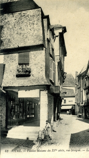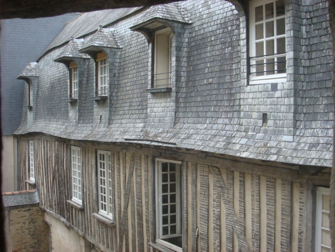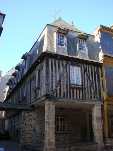 Contrairement à ses voisines, le porche de cette maison n'est pas soutenu par des poteaux en bois mais en pierre qui semblent avoir remplacé ceux d'origine, vraisemblablement en bois. L'originalité de cette maison réside dans sa double façade, l'une commerciale au sud sur rue et l'autre résidentielle à l'ouest sur cour. Ainsi, au cours de la seconde moitié du 20e siècle, l'ancienne baie de boutique située sous le porche a été comblée par un mur en maçonnerie de moellon percé d'une fenêtre centrale. Le comble à la Mansart, l'absence d'encorbellement ainsi que le pseudo alignement des baies témoignent de la fin du 17e siècle. La présence d'un escalier droit à balustres face à la porte ouest ainsi que le pan de bois aujourd'hui apparent mais à l'origine destiné à être enduit évoquent les hôtels particuliers de la Place des Lices à Rennes, construits dans les années 1660. Des cartes postales du début du siècle montrent qu'à cette époque, le pan de bois de l'étage était essenté d'ardoise. Les premières marches de l'escalier à balustres ont été remplacées. Cet escalier à balustres a remplacé un ancien escalier en vis dont il subsiste la partie inférieure du noyau. Le nombre important de lucarnes ainsi que la grande hauteur du comble témoignent ou bien d'une volonté de rendre habitable cette partie de la construction, ou bien de l'utiliser comme lieu de stockage. Le positionnement de la maison en bordure d'un passage permet d'apprécier la profondeur de la parcelle laniérée.