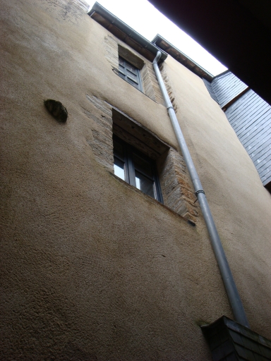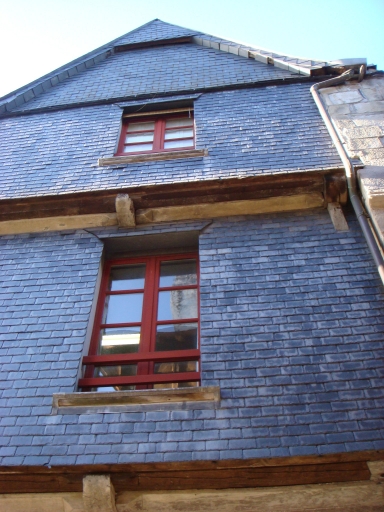 Cette maison à porche à mur pignon sur rue s'élève sur trois niveaux sous comble. Les niveaux supérieurs sont recouverts d'un essentage d'ardoise et présentent un faible encorbellement. Le porche est soutenu par des piles en grès dont l'une est "intégrée" dans l'arc en plein cintre qui délimite la propriété à l'Est. Sous le porche, la porte latérale Est est en anse de panier ; elle est surmontée d'un oculus. Les solives du plafond du porche sont apparentes. Le premier étage a conservé deux cheminées situées sur les murs gouttereaux est et ouest. La cheminée ouest de la pièce sud de l'étage est réalisée en grès ; elle possède des piédroits en forme de colonnes. A droite de cette cheminée, se trouve l'accès aux anciennes latrines. La cheminée située sur le mur est présente sur son linteau un décor sculpté composé de poires entourant une couronne végétale dans laquelle se trouve un cuir portant une marque de marchand ainsi que la date de 1563.