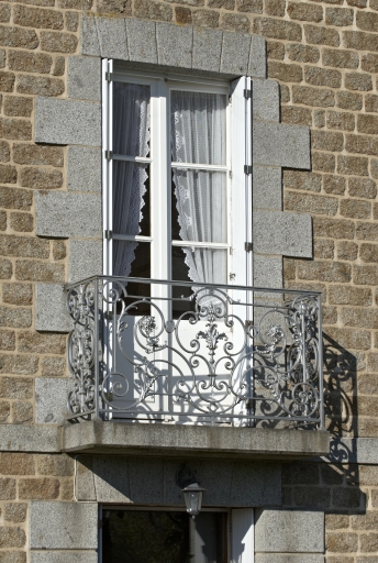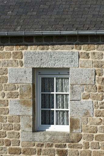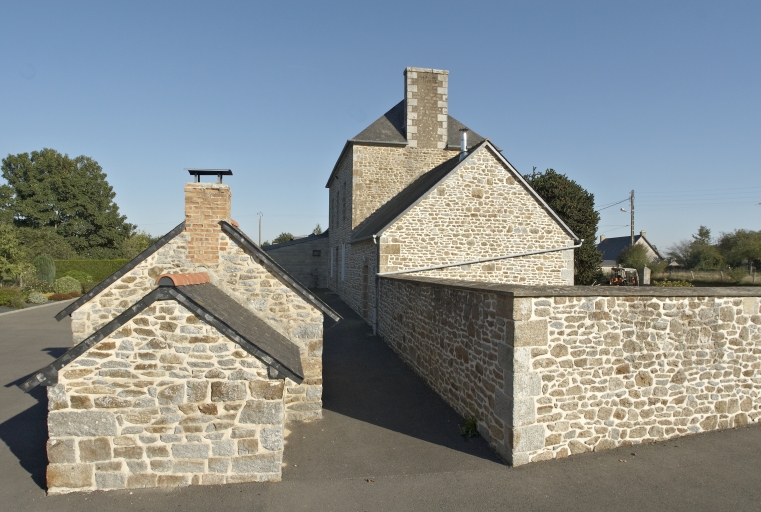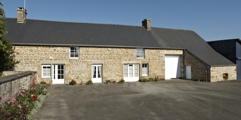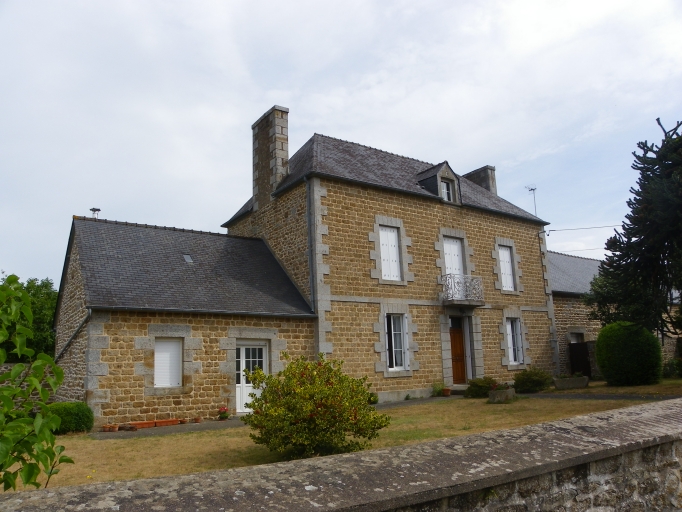 Tous les éléments de la ferme s'inscrivent dans un alignement, orienté est-ouest, qui comprend le logis à l'ouest et les parties agricoles à l'est. Le logis reprend les standards des maisons de village de la seconde moitié du 19e siècle. Il est doté d'un étage et de combles à surcroît, percé de trois travées de fenêtres, avec une toiture à croupes et une petite lucarne interrompant l'avant toit au niveau de la travée centrale. Les matériaux utilisés sont le granite jaune pour la maçonnerie courante, la pierre de taille de granite bleu est choisie quant à elle pour les chaînes d'angle et les encadrements des ouvertures. Le décor est constitué par ce jeu de couleur entre les deux types de granites ainsi que par un bandeau de granite entre le rez-de-chaussée et l'étage. On peut également noter la présence d'un garde-corps en fonte à l'étage, orné de décors végétaux. Les éléments agricoles comportent une petite maison, probablement destinée aux ouvriers agricoles, une étable, des granges et des soues à cochons. L'ensemble est doté d'un étage de comble percé de deux fenêtres. La maçonnerie est composée de moellons de granite jaune et bleu et de pierre de taille pour les encadrements des ouvertures.
