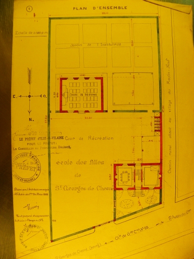Tableau d'assemblage du plan parcellaire de la commune de Saint-Georges-de-Chesné, Canton de Saint-Aubin-du-Cormier, Arrondissement de Fougères, Département d'Ille-et-Vilaine. Terminé sur le terrain le 26 juillet 1834, sous l'administration de Mr. Cahouet, Préfet, Mr Derennes, Maire, et sous la direction de Mr Lambert, Directeur des Contributions, Mr Lesné, Géomètre en chef, par Mrs Piedvache et Lécluze, Géomètres du cadastre, échelle 1/10000e. (A.D. Ille-et-Vilaine).