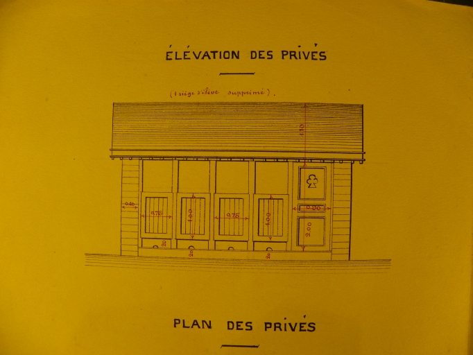 Cette ancienne école des filles, aujourd'hui école communale, fut construite au tout début du 20e siècle. L'architecte Lemée, de Saint-Aubin-du-Cormier, rédigea un devis estimatif en 1898, l'adjudication eut lieu le 30 avril 1900 et la réception définitive des travaux fut validée le 4 décembre 1902. Les constructions originelles consistaient en une maison d'habitation pour l'institutrice, une salle de classe et un préau couvert. L'ensemble a conservé une belle authenticité et n'a subi que de lègères modifications. La maison a été adjointe d'une extension au sud à la fin du 20e siècle, tandis que le préau a été allongé à l'ouest à la même époque.