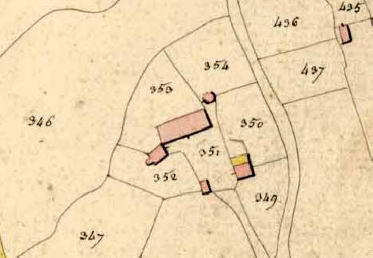 Tableau d'assemblage du plan parcellaire de la commune de Saint-Ouen-des-Alleux, Canton de Saint-Aubin-du-Cormier, Arrondissement de Fougères, Département d'Ille-et-Vilaine. Terminé sur le terrain le 26 août 1833, sous l'administration de Mr. Cahouet, Préfet, Mr Derennes, Maire, et sous la direction de Mr Lambert, Directeur des Contributions, Mr Lesné, Géomètre en chef, par Mrs Delamaire et Margueritte, Géomètres du cadastre, échelle 1/10000e. (A.D. Ille-et-Vilaine).