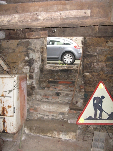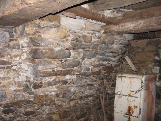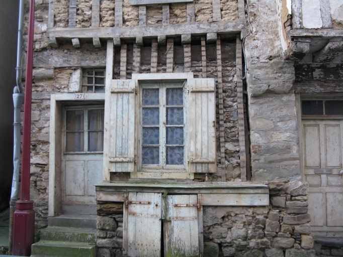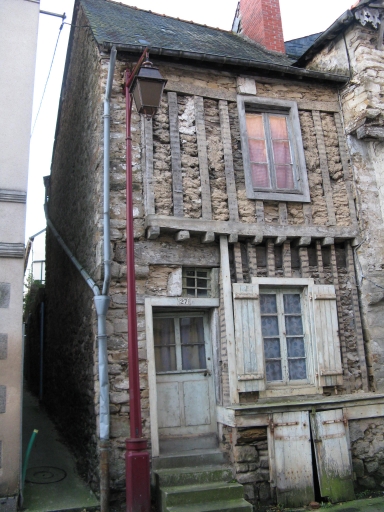 - Quatre niveaux : une cave, un rez-de-chaussée, un étage et un comble. - Plan quadrangulaire de dimension assez réduite. - Espace intérieur composé d´une seule pièce par niveau. Façade nord : - Façade sur la rue du Bourg-aux-Moines correspond au mur gouttereau nord de la maison. - Soubassement saillant en moellon de schiste et de grès et muni d´un encavage. - Porte d´entrée située sur la gauche de la façade accessible par quatre marches en béton. - RDC percé d´une fenêtre avec un encadrement en bois. - Premier étage : léger encorbellement. Percé d´une fenêtre avec un encadrement en bois. Façade est et ouest : - Mur pignon est, aveugle : moellon de schiste et de grès. - Mur pignon ouest accolé à la construction voisine du n° 29. Façade sud : - Accès depuis le passage latéral. - Arrière de la maison occupé par des dépendances construites en maçonnerie. Dépendances formant une continuité avec le mur pignon est de la maison et adossées au mur gouttereau du n° 29. - Une des dépendances possède une cheminée sur le mur sud. - Volume des dépendances correspond au rez-de-chaussée de la maison. - Dépendances couvertes d´un toit plat bétonné, utilisé comme terrasse. Terrasse accessible par l´extérieur depuis l´arrière de la parcelle ou par l´intérieur depuis la pièce située à l´étage par une porte-fenêtre. Cave : - Angle sud-ouest : départ d´un escalier en vis avec une structure en pierre et vestiges des contremarches en bois. - Mur pignon est : base d´un conduit de cheminée en pierre. Rez-de-chaussée : - Structures horizontales : planchers à travure composée. - Planchers à poutres et solives : torchis dans l´entre solivage, lattis fixé sous les solives et enduit à base de chaux ou de plâtre sur le tout. - Mur est : ancienne cheminée (cf. départ de conduit dans la cave). - A chaque niveau : traces de cette ancienne cheminée (corbeau au rez-de-chaussée, niche creusée dans l´ancien conduit au premier étage et traces de l´emprise du conduit dans les combles). - Mur ouest, mitoyen avec le n° 29 : autre cheminée. Petite cheminée recouverte de boiseries. Distribution : - Escalier en vis dans la cave : a complètement disparu dans les niveaux supérieurs. - Traces de l´ancien escalier en vis dans le plafond du rez-de-chaussée. - Accès actuel à l´étage et au comble : escalier en vis situé dans la salle B du n° 29. Premier étage : - Plancher en béton ajouté. - Traces du conduit de cheminée sur le mur est.