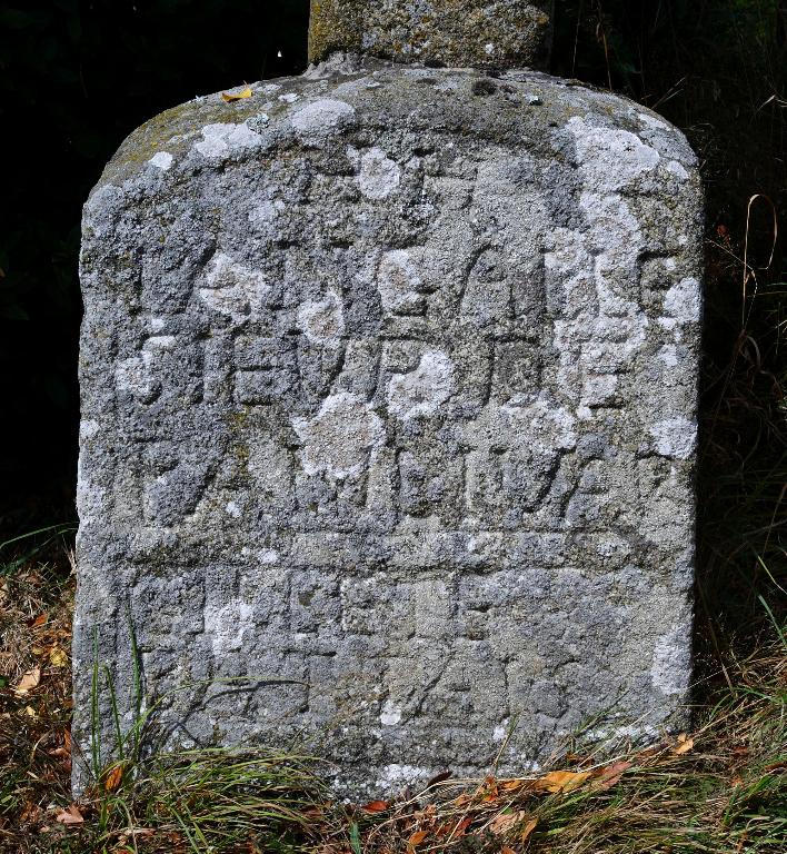Cette croix est réalisée en granite. Sa hampe est ornée d’un motif d’ostensoir et l’inscription « INRI » se trouve sur les bras.