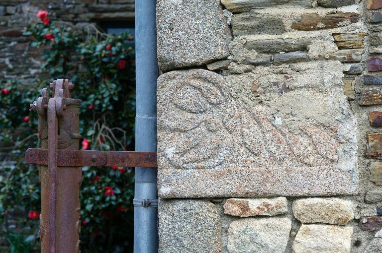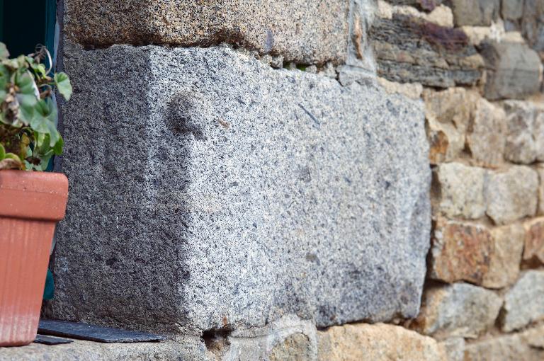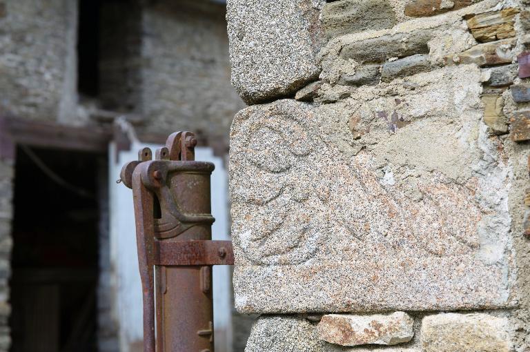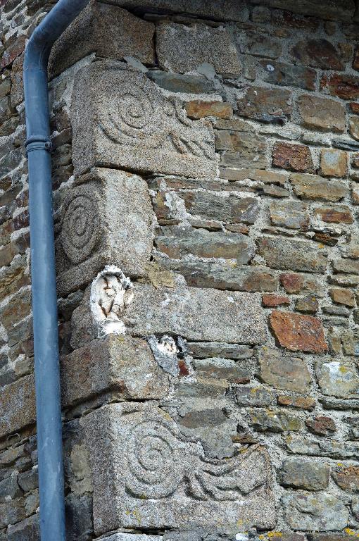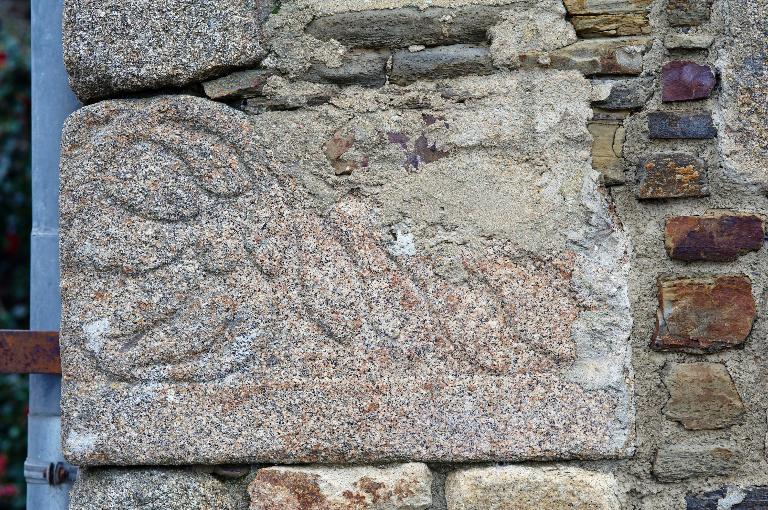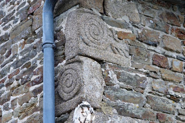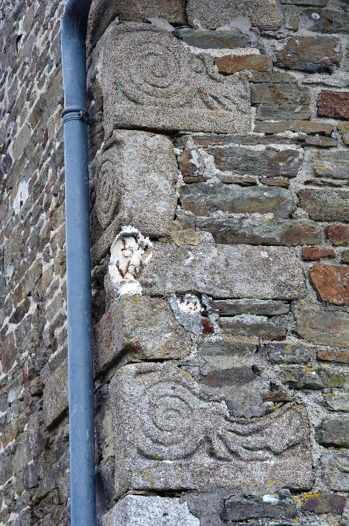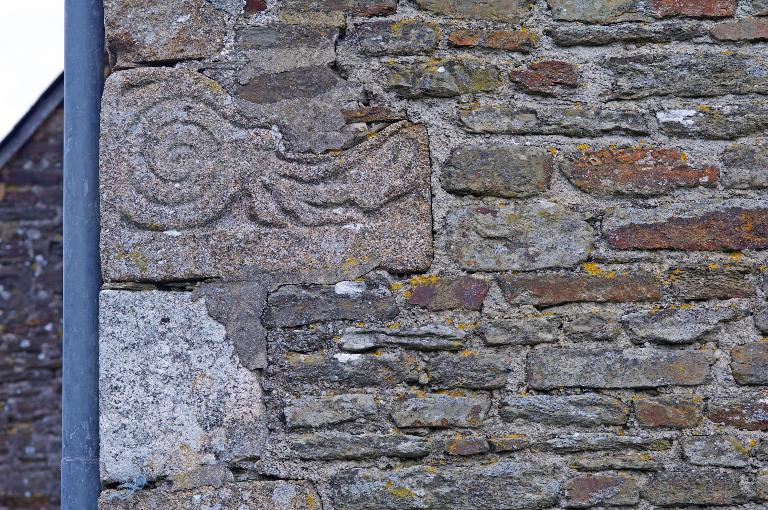 Le chaînage d'angle remploie des pierres sculptées présentant un décor de volutes.