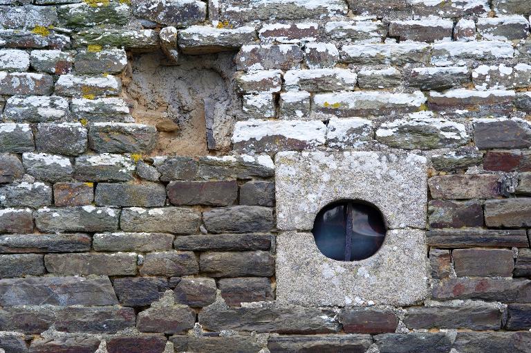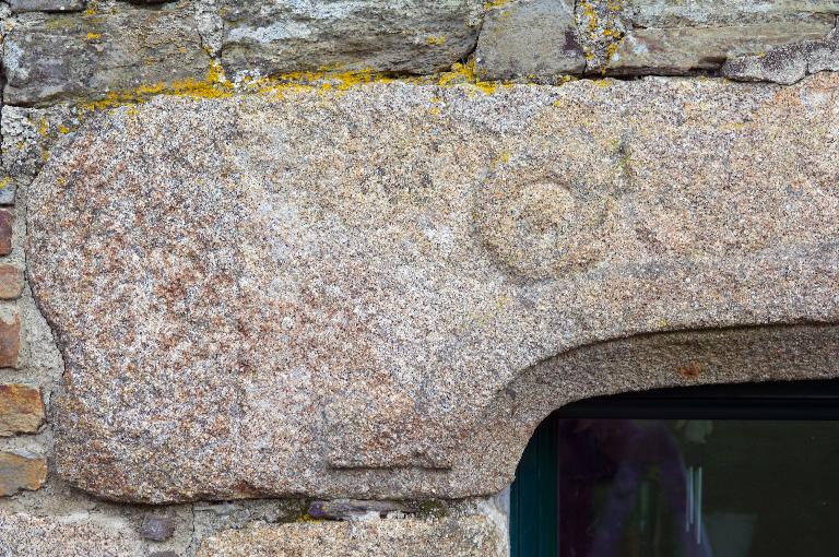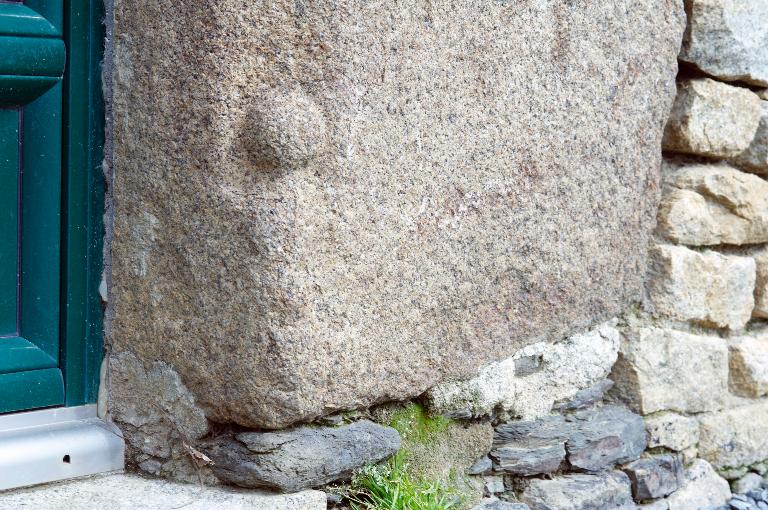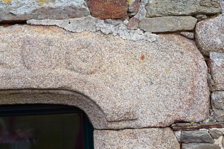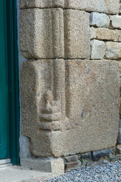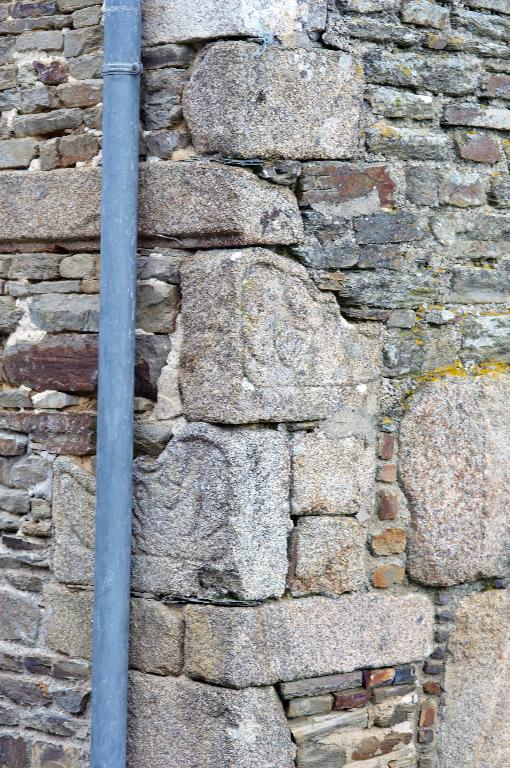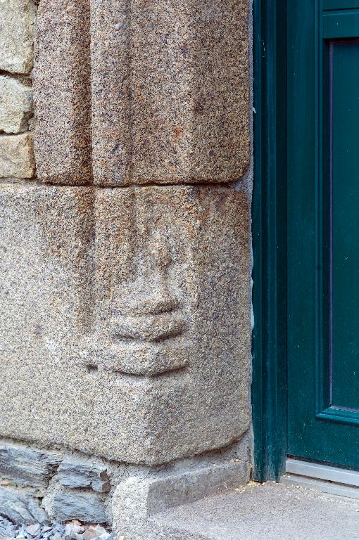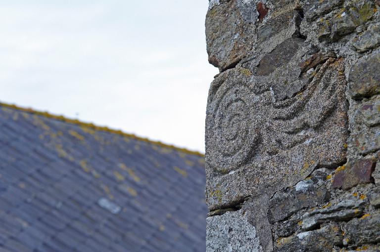 Le chaînage d'angle remploie des pierres sculptées présentant un décor de volutes.