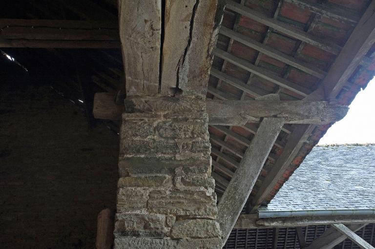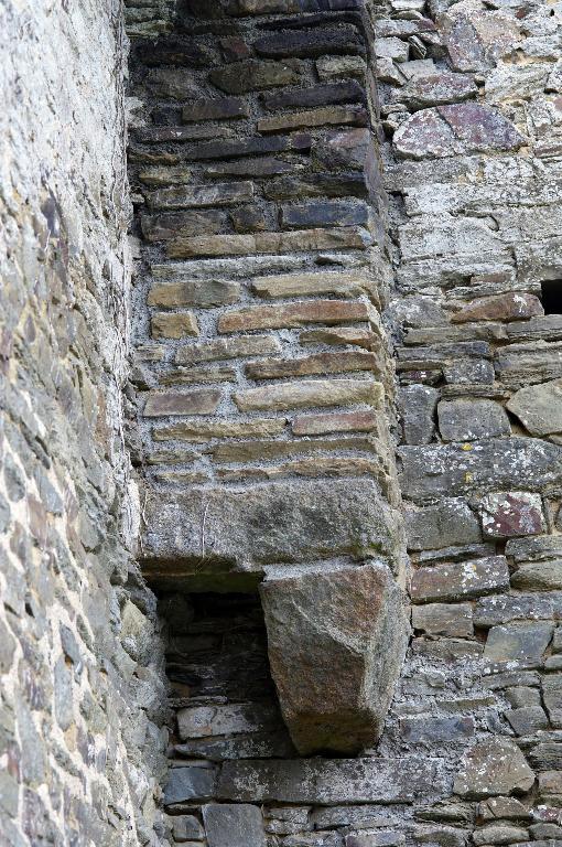 L'intérieur, bien que remanié, conserve un escalier intérieur hors oeuvre en bois à retours sans jour avec palier et repos, la rampe de l'escalier remploie un piédroit de cheminée en granite (demi-colonne à listel). La façade postérieure présente une tour carrée hors oeuvre dasn laquelle se situe l'escalier ainsi que des latrines saillantes accessibles par l'escalier.