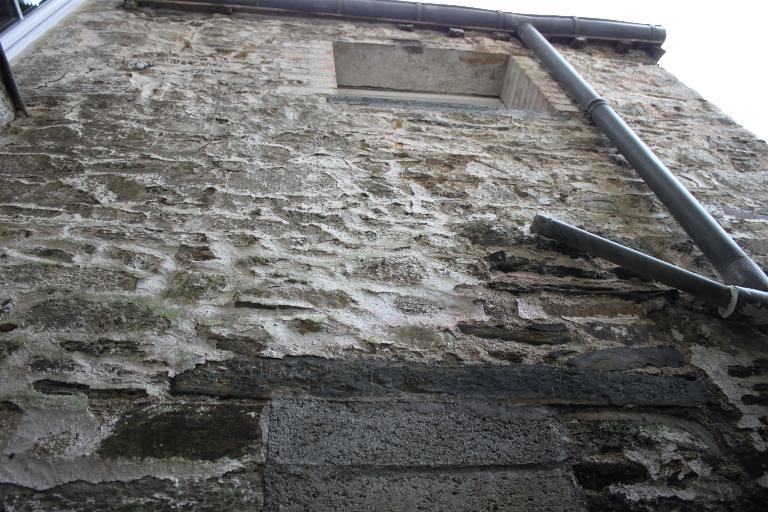 - Mur nord : une ouverture donnant sur la cour nord-est, jambages en grès, linteau en bois, imposte fixe obstruée avec une plaque isolante. Les murs de chaque côté sont ébrasés. Sur le côté ouest de la porte il y a un muret en moellons en schiste et en grès.