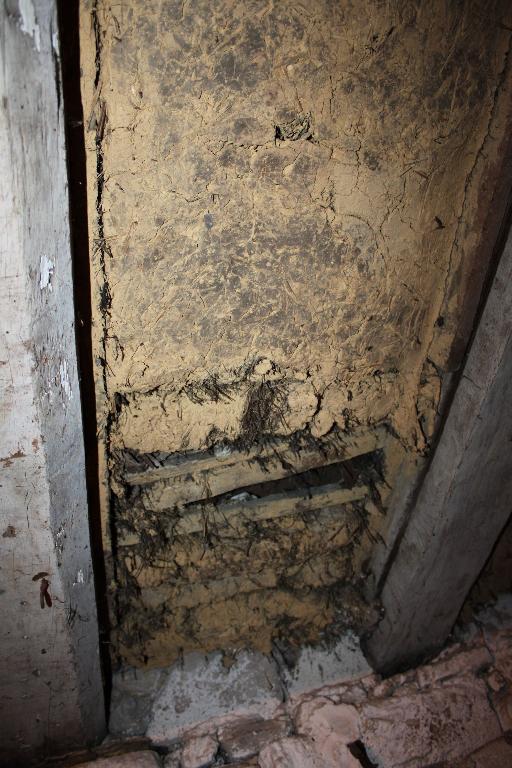 - Mur nord : ancienne ouverture comblée, jambages en moellons de grès, linteau en bois.