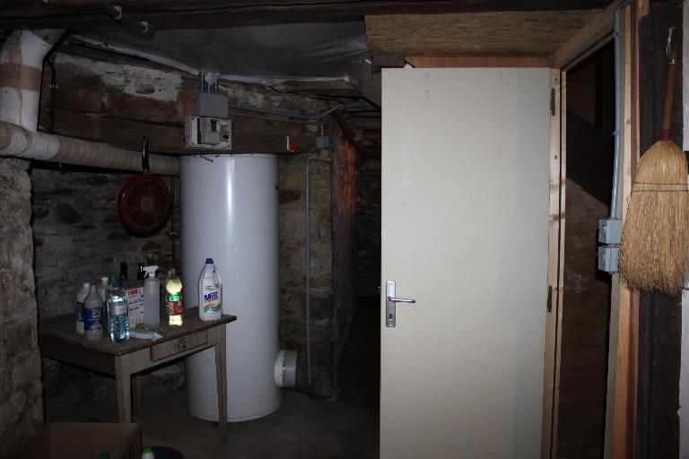 - Cave : une porte en bois avec un linteau en bois, jambages en moellons en schiste et en grès ; au dessus se trouve une imposte fixe vitrée en bois avec un linteau chanfreiné en bois et des jambages en pierre de taille en grès, avec chanfrein. On peut remarquer des trous supposant la présence d'une ancienne grille.