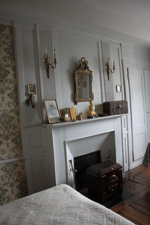 - Une cheminée sur le mur ouest avec une dalle de foyer en carreaux de terre cuite, une hotte recouverte de boiseries et décorée de deux pilastres toscans de chaque côté.