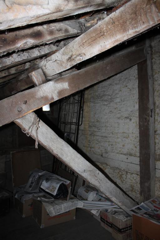 - Plafond : quenouilles enduites en torchis ; poutres de petites sections taillées mécaniquement ; dalles de schiste supposant la présence d’une cheminée.