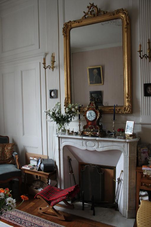 - Mur ouest : moulure en bois ; cheminée en marbre, assise en marbre ; deux pilastres cannelés de chaque côté de la cheminée.