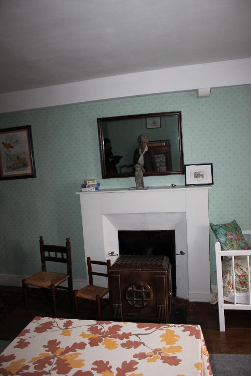 - Mur est : cheminée en bois avec une dalle de foyer en carreaux de terre cuite ; poutre de petite section posée sur deux corbeaux.