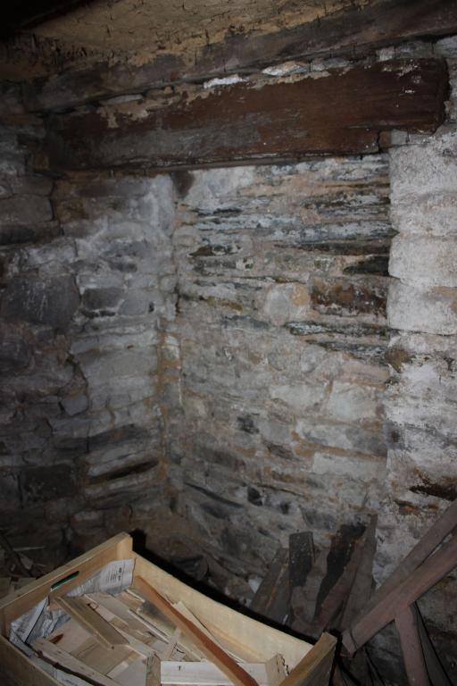 - Mur est : présence d'une niche, assise en schiste et en grès, jambages en pierre de taille en grès, linteau en schiste, feuillure ; ouverture comblée, jambages en moellons en schiste et en grès ; mur concave supposant la présence d’un escalier en vis.