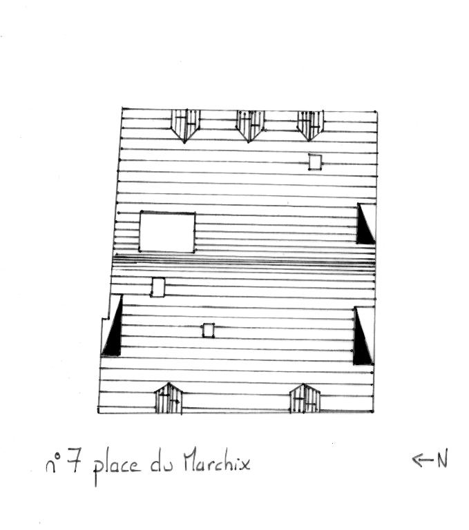 La distribution des pièces, desservies par un même couloir, interdit une datation plus ancienne. Seule la charpente aux fermes rapprochées, assemblées à tenons et mortaises et les carreaux de terre cuite, de taille réduite, pourraient contrecarrer cette hypothèse. En effet il est difficile de dater le bâtiment de la première moitié du 16e siècle en se basant uniquement sur ces éléments. D'autant que l'on ne trouve pas d'échantignoles taillées sur les arbalétriers, présents dans les habitations de la place, datées de cette époque.