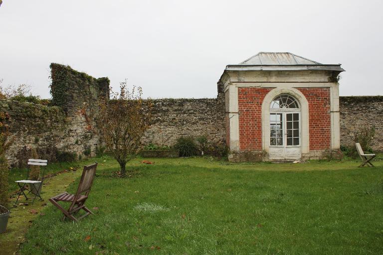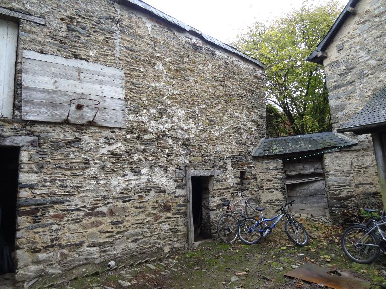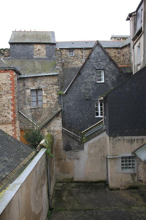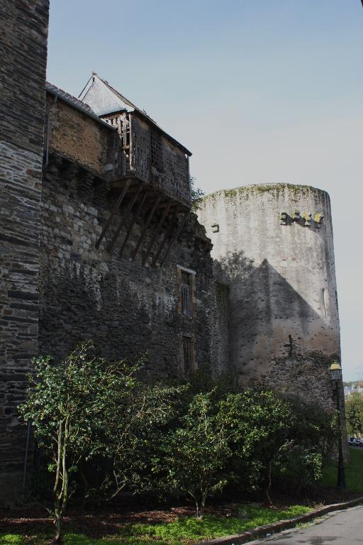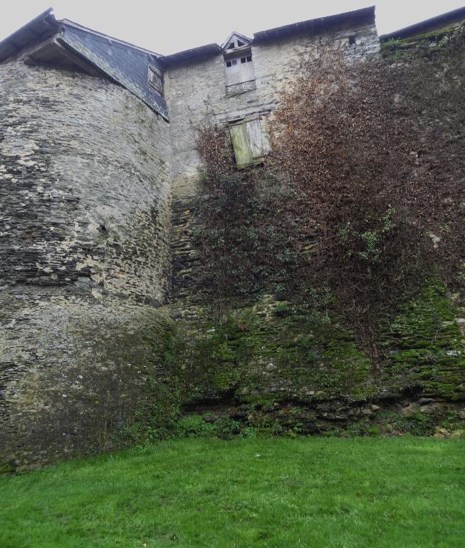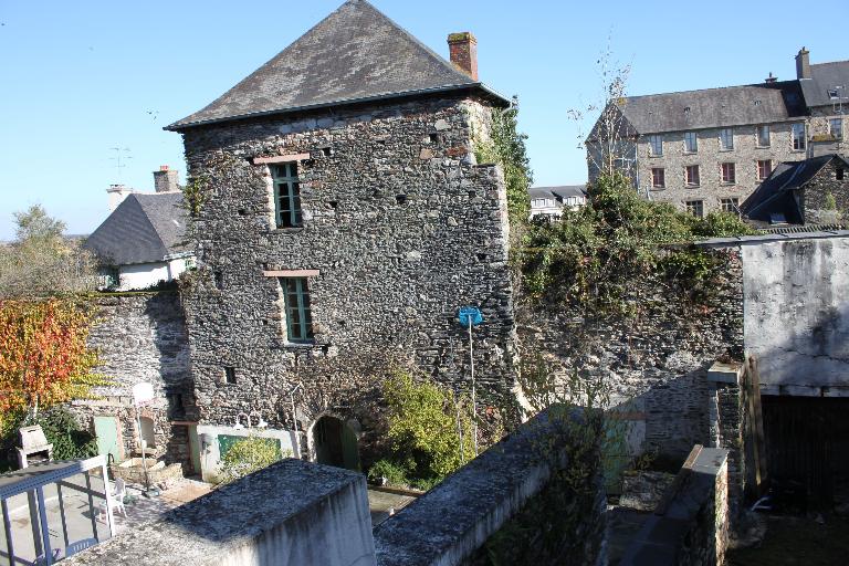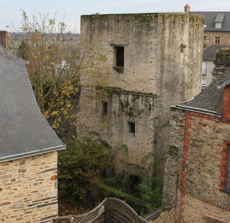La tour sur la propriété n°5, au tournant des fronts nord et est, est une tour carrée de construction moderne venue remplacer et consolider les ruines de la tour de la Fresnaye, dont on peut encore voir les arrachements en schiste noir du 13ème siècle sur les flancs est et ouest. Le plan de 1711 indique que la tour était restée béante après les dommages causés par les troupes du duc de Mercoeur (fin du siège le 14 août 1589). Le mur de forme rectangulaire, consolidant la tour, a vraisemblablement été édifié au 19ème siècle, entre 1811 et 1843, comme le montre le cadastre de 1811 et le plan d'alignement de 1843.