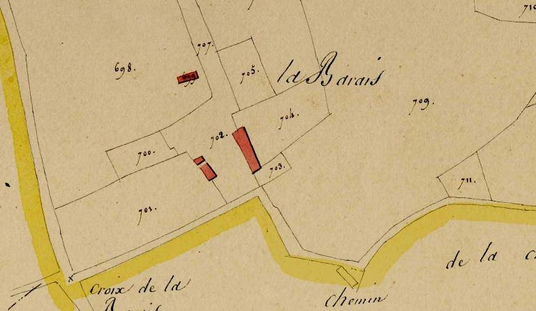 Ces éléments permettent de dater ce bâtiment du 16e siècle. Il s'agissait peut être d'un bâtiment de l'ancien manoir de la Barais cité dans l'ouvrage de Paul Banéat. On y apprend que l'ancien manoir de la Baraye était le gage féodé d'une sergentise de la forêt de Fougères qui fut propriété successive des familles Coupechon (en 1399), Dorenge (en 1430), le Clerc (vers 1471), Aucher (vers 1531), Launay (en 1541), Eschard seigneurs de la Ponchaye (en 1587), Crosnier seigneurs de Villiers (vers 1617), Mesnière et Bidard (en 1623). Le manoir est ensuite partagé en 1645 en deux parties. Une partie devient la propriété de la famille Ferron seigneurs de la Vairie (en 1645), puis de la famille Frain seigneurs de la Villegontier en 1672. L'autre partie devient la propriété de la famille Gaultier seigneurs du Pontasny (en 1676), de la famille Nos seigneurs de la Tendrais (avant 1678) et de la famille Frain seigneurs de la Villegontier (en 1678 et en 1789).