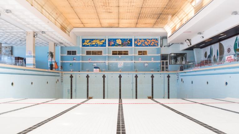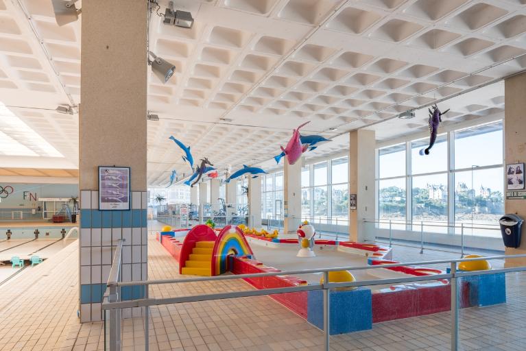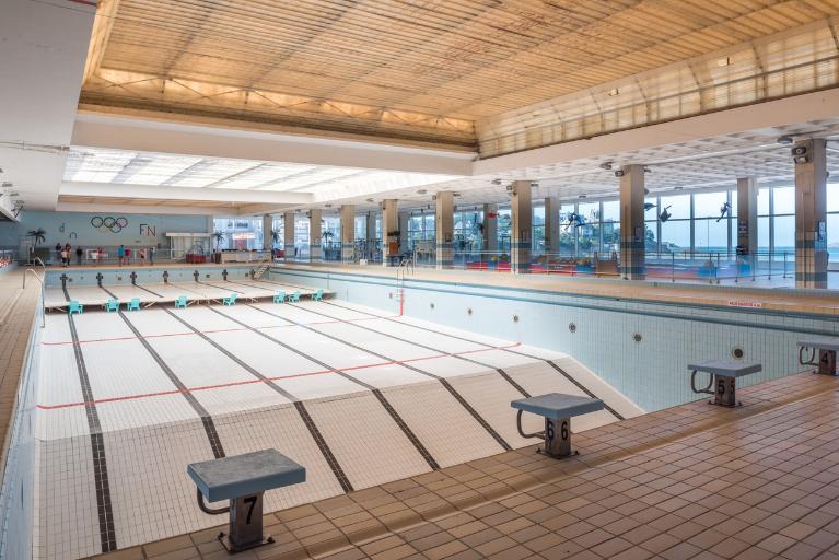 Après l'abandon en 1962 d'un projet de rénovation de l'ancienne piscine du casino balneum, fermée depuis des années, la municipalité opte pour la destruction de celle-ci et la construction d'un nouvel équipement de dimensions olympiques avec bassin de 50 m x 17,50 m en eau de mer. Le 31 octobre 1963, le conseil municipal approuve le projet de l'architecte J. Vitrier et de l'ingénieur G.-M. Présenté, qui fait l'objet d'un arrêté ministériel d'approbation technique le 29 juin 1964 et d'une subvention de 725 000 F au taux de 25% le 22 mai 1965. Le chantier s'ouvre en janvier 1966 et la réception définitive est prononcée le 17 décembre 1968. Entretemps, l'équipement a été inauguré le 1er juillet 1967. Un demi-siècle plus tard, son état est médiocre (dégradation de la structure béton, notamment au niveau de la toiture) et la question de son devenir est étudiée par les élus.