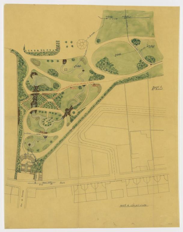 Plan en couleurs du jardin des plantes, installation de l'eau, pose des canalisations en fonte, construction des acqueducs en maçonnerie, de la cascade et de la rivière anglaise. 1884