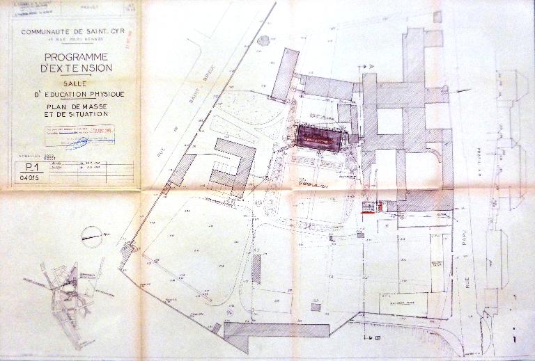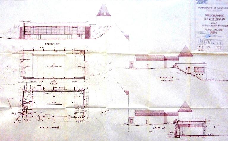 Salle d’éducation physique de 30 m de longueur sur 13,50 m de largeur, et de 5,50 m de hauteur libre, orientée à l’est, face aux terrains de jeux. Les dimensions donnent une aire d’évolution de 20 m sur 11,50 m de largeur, conforme aux normes du gymnase type A du ministère de l’Éducation nationale, destiné aux établissements du premier et second degré de 10 à 20 classes. Ossature en béton armé, avec remplissage en voile de béton banché sur terre-plein, couverture en terrasse accessible, menuiseries en bois et fer. Bardages verticaux en plaques ondulées rigides, fixées sur ossature métallique.