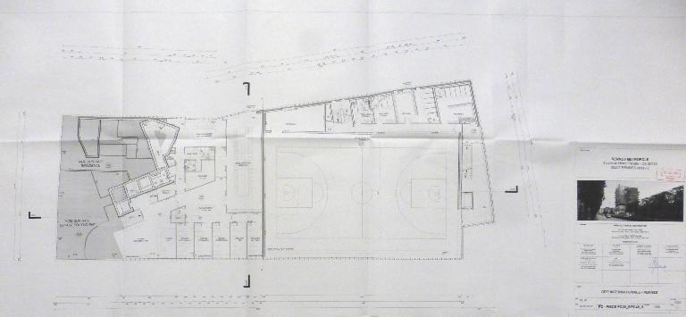 Le centre sportif, situé au sud de la parcelle côté esplanade, s’organise sur trois niveaux. Le rez-de-chaussée comprend le hall et le bureau d’accueil, ainsi que la salle de sports d’opposition (278 m2). Le grand gymnase (692 m2) est au premier étage, ses vestiaires sont placés sur deux niveaux superposés. La salle d’activité physique et sportive (323 m2) est placée en haut, au-dessus du gymnase. Les trois niveaux sont distribués par un escalier et un ascenseur placés en façade sud. Entièrement vitrée avec des lames de verre orientable de type Naco, celle-ci a un système de pare-soleil inversé par rapport aux autres éléments du complexe : les éléments verticaux deviennent horizontaux pour une meilleure efficacité, introduisant dans la composition une variation graphique issue d’une nécessité climatique . Les pare-soleil sont interrompus pour dégager trois loggias qui laissent voir depuis la place l’activité à l’intérieur. Une partie de la toiture est végétalisée.