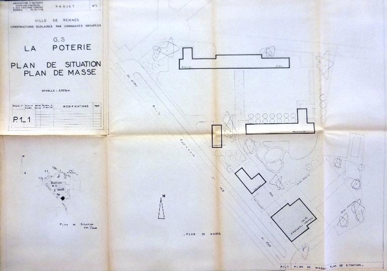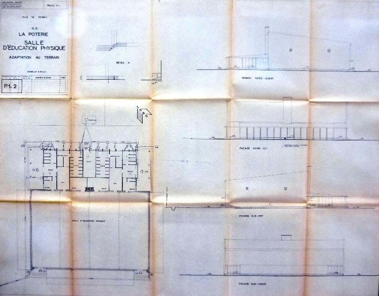 Le gymnase de la Poterie appartient à une série d'équipements sportifs scolaires construits au milieu des années 1960. Le 12 octobre 1964, le conseil municipal approuve en effet les dossiers de construction de salles d'éducation physique dans les groupes scolaires Albert de Mun, Châtillon II, la Poterie, Châteaugiron, la Grenouillais et Jeanne Jugan et décide d'en traiter l'exécution par marché de gré à gré avec l'entreprise Tible, de Granville. Le prototype a été conçu par Louis Cornille, architecte à Avranches. Le marché est passé le 16 novembre 1964, l'ordre de service délivré le 5 février 1965 et la réception provisoire prononcée le 28 décembre de la même année.