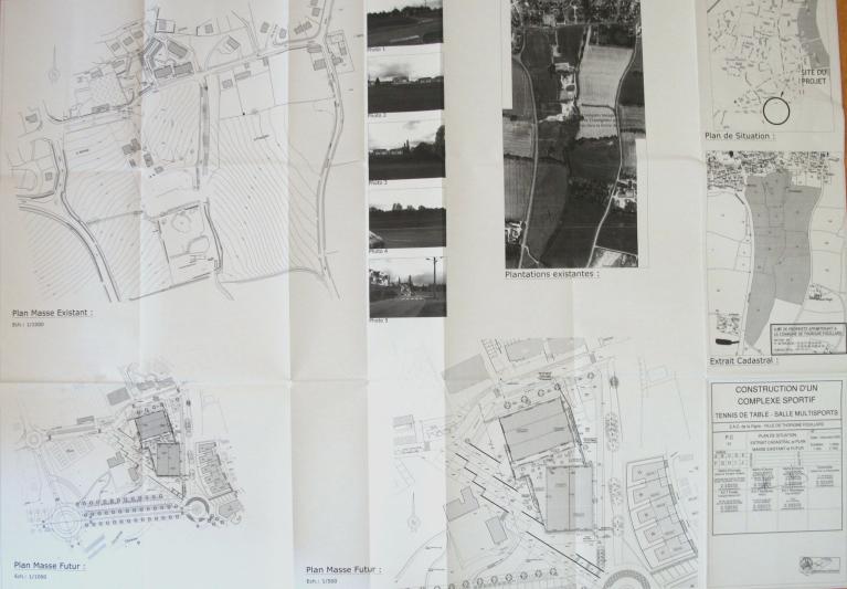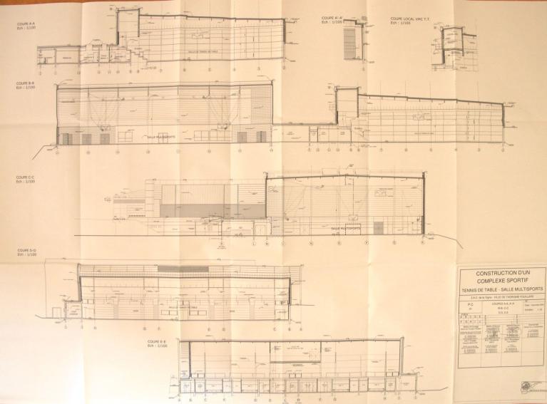 "Le projet est composé de deux volumes principaux (les deux plateaux sportifs), articulés entre eux par un 3e volume (hall, vestiaires et autres espaces de services), selon un angle dû à la configuration du terrain et aux prospects périphériques. Au nord, en bordure de la rue des Moulins, l'architecture et les matériaux choisis visent à rendre le volume abritant la salle de tennis de table plus "urbain" : la couverture à faible pente est recouverte en zinc, le bâtiment est enterré quasiment jusqu'à mi-hauteur (afin de ne plus culminer qu'à 4,30 m au-dessus de l'aménagement paysager qui borde la rue), les façades alternent des parties traitées en bardage métallique et d'autres en béton lasuré. Le but est d'atténuer l'effet "hors échelle" que la construction pourrait avoir par rapport à la rue. Au sud, le second volume est volontairement simple, répondant aux exigences sportives, techniques et financières. Du fait de la pente assez forte de la parcelle, la salle omnisports sera posée sur une plateforme dont les amples talutages permettront un aménagement paysagé de mise en valeur. Le choix d'une couleur neutre pour le bardage métallique permettra à ce second bâtiment de s'élever avec une relative discrétion sur le fond des arbres existants, en arrière-plan du 1er bâtiment par rapport à la rue des Moulins et derrière un rideau d'arbres et à bonne distance du futur axe est-ouest de la ZAC. A l'articulation de ces deux premières parties, le 3e volume abritera tous les autres locaux, essentiellement en béton lasuré, de plus faible hauteur (environ 3,60 m), permettra d'atténuer l'impact visuel des salles lorsqu'on s'approchera du projet, permettant ainsi de retrouver une échelle plus proche de celle du piéton." (F. Michot, Notice paysagère, décembre 2005)