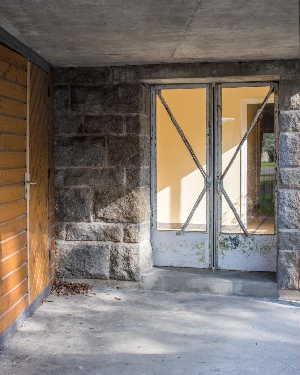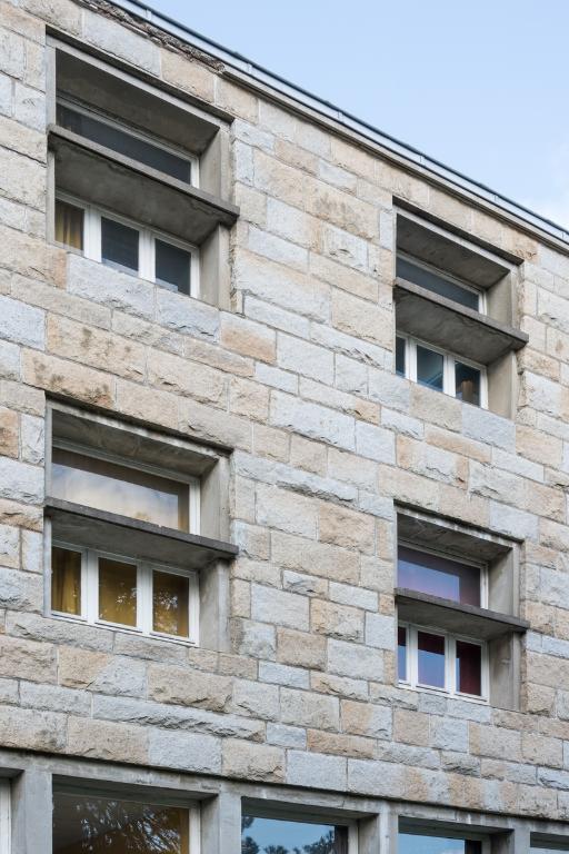 Murs composites à parement de moellon de béton de granit et contre-parement en béton de gravillon banché. Planchers en béton armé avec hourdis en terre cuite. Ossature, poutres, chaînages, escaliers en béton armé. Appuis de baies, consoles et bandeaux en béton moulé brut de décoffrage. Cloisons en parpaings de ciment ou briques creuses. Enduits extérieurs en mortier bâtard.