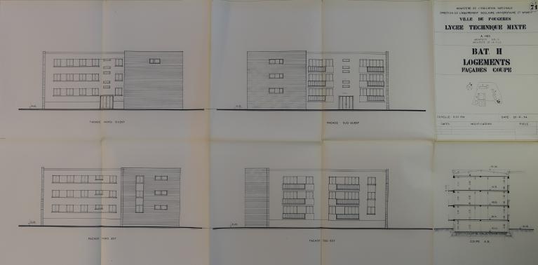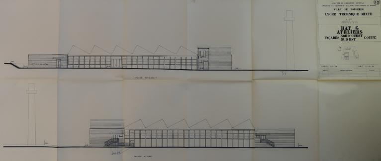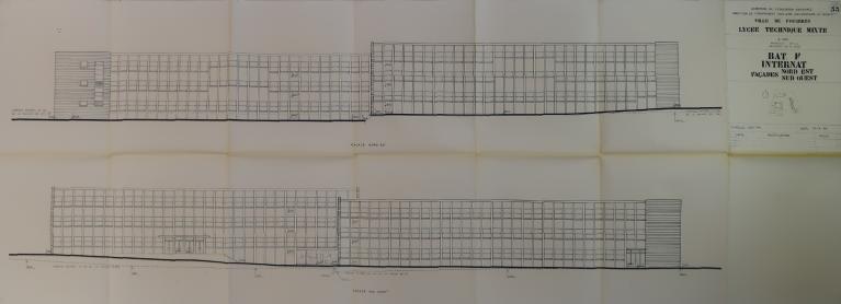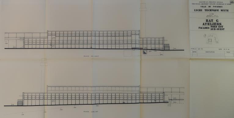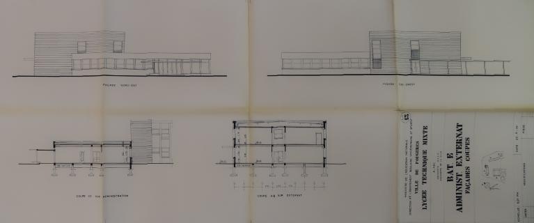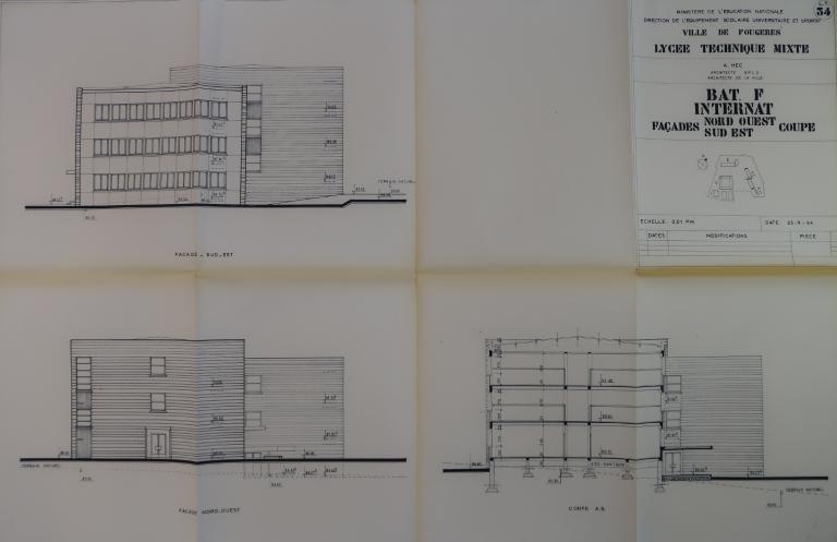Archives municipales de Fougères : 2 NM 5 - 5/1. Hec [Albert], Plans et élévations du lycée technique mixte de Fougères, 1964