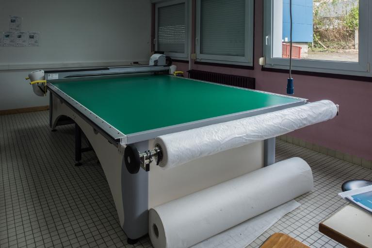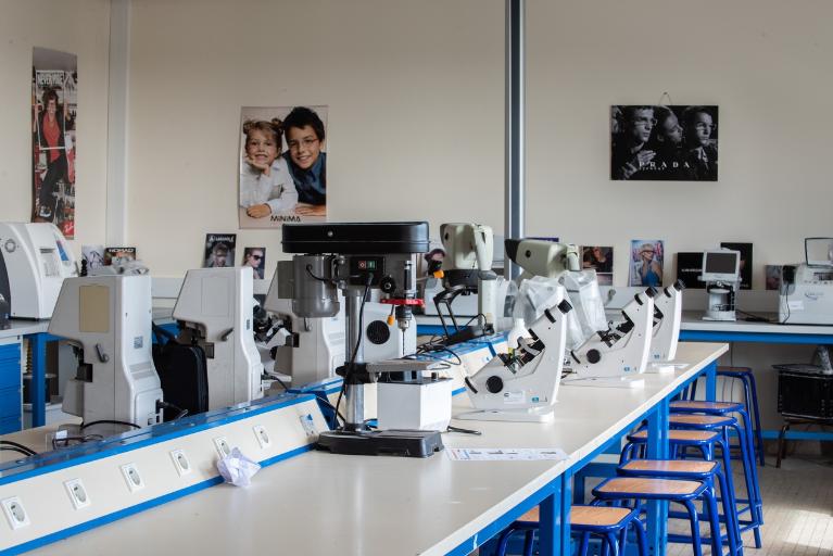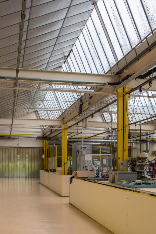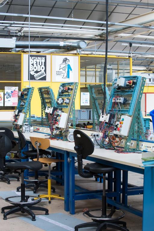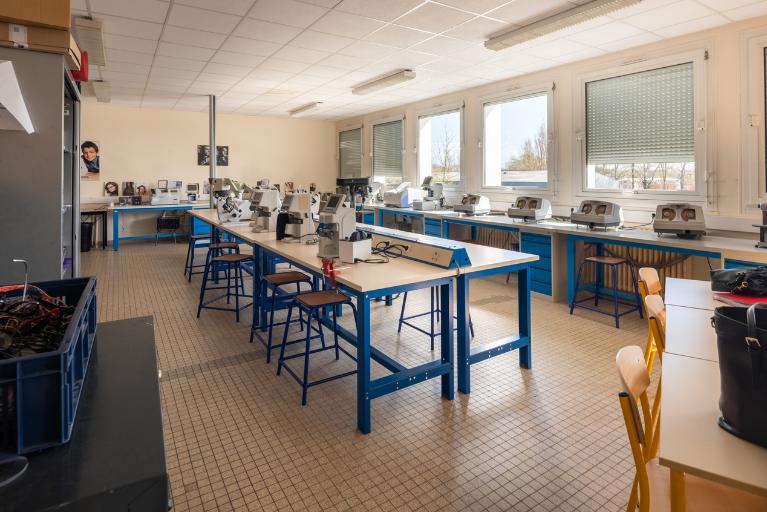 Quarante-cinq mètres au sud de celui-ci, sur un pallier en contrebas, les ateliers de plan carré, occupent une surface de 3650 m2 environ. En leur pourtour sont situés des salles de classe et des espaces de stockage, installés dans des bâtiments à toitures-terrasses. Au centre, les ateliers sont couverts de sheds. Seule le bâtiment de façade, côté externat, comporte deux niveaux.
